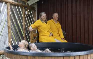 Saunan yhteydessä on myös puulla lämmitettävä kylpytynnyri, joka kruunaa illan – lämpimässä vedessä rentoutuminen tähtitaivaan alla on elämys, joka jää mieleen. Saunan ja paljun voi lämmittää itse tai tilata valmiiksi lämmitettynä, jolloin voit vain saapua ja nauttia.